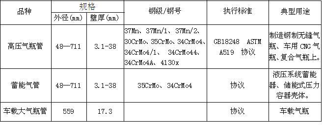 ·高壓氣瓶管: 用于制造鋼制無縫氣瓶、車用CNG氣瓶、復(fù)合氣瓶。公司生產(chǎn)的高壓氣瓶管為管制瓶制造提供優(yōu) 質(zhì)的熱軋薄壁無縫鋼管,具有內(nèi)外表面質(zhì)量好、壁厚均勻、質(zhì)量輕、生產(chǎn)率和成材率高、成本低等優(yōu)點,便于無縫管制瓶瓶底收口的關(guān)鍵技術(shù)的應(yīng)用,使氣瓶管的制 造從采用鋼坯經(jīng)沖孔拉撥轉(zhuǎn)向采用薄壁無縫鋼管制造,并已成為發(fā)展趨勢,深受用戶歡迎。 ·蓄能器管: 用于液壓系統(tǒng)蓄能器、儲能式壓力容器殼體等。 ·車載大氣瓶管 用于車載大口徑氣瓶。 |